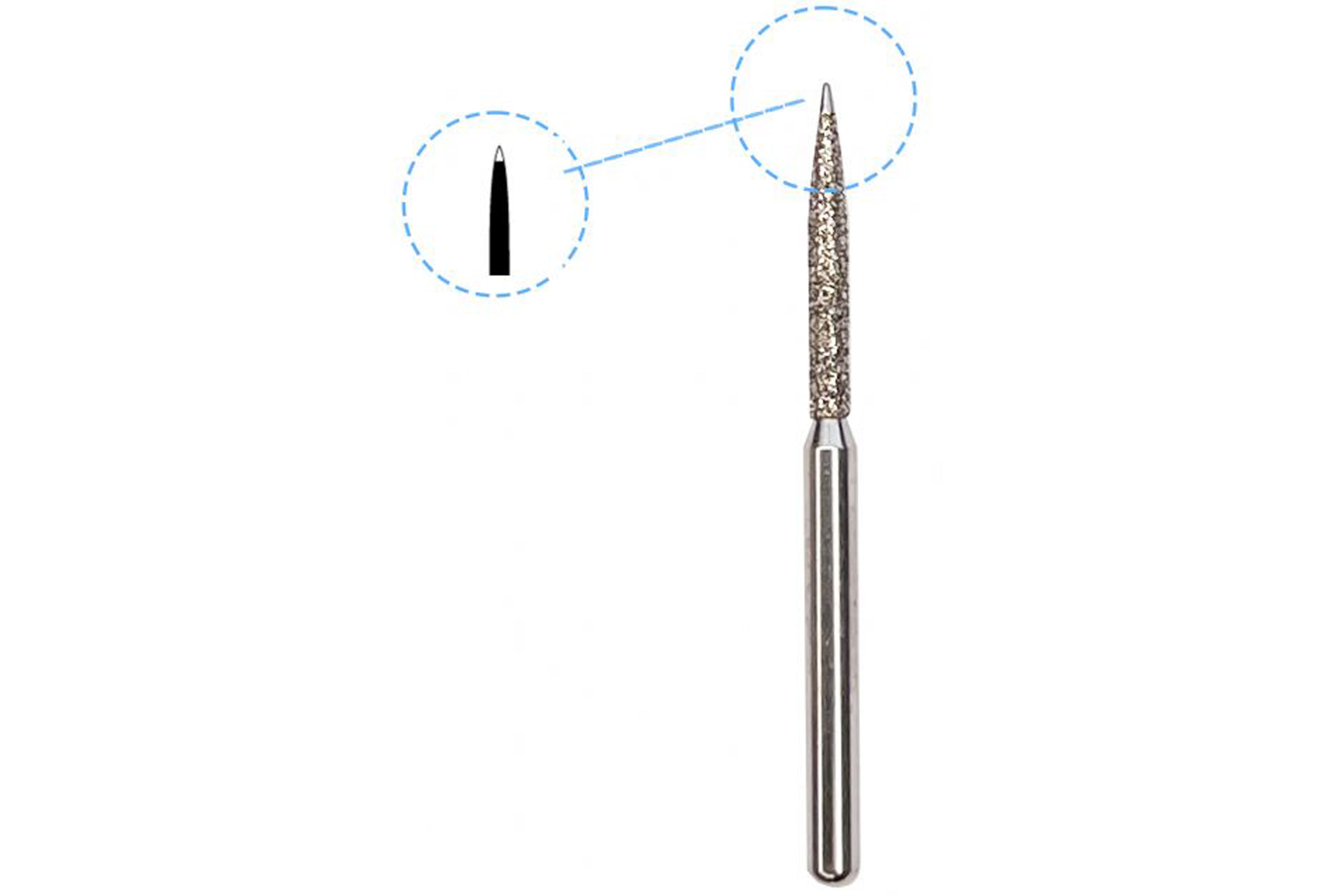 The Edenta Flame Safe-End diamond bur is a precision Swiss-made tool featuring a flame-shaped medium-grit head (Ø 0.12 mm, length ~ 10 mm) with a safe-end tip to protect adjacent surfaces, ideal for targeted cavity or crown margin preparations.