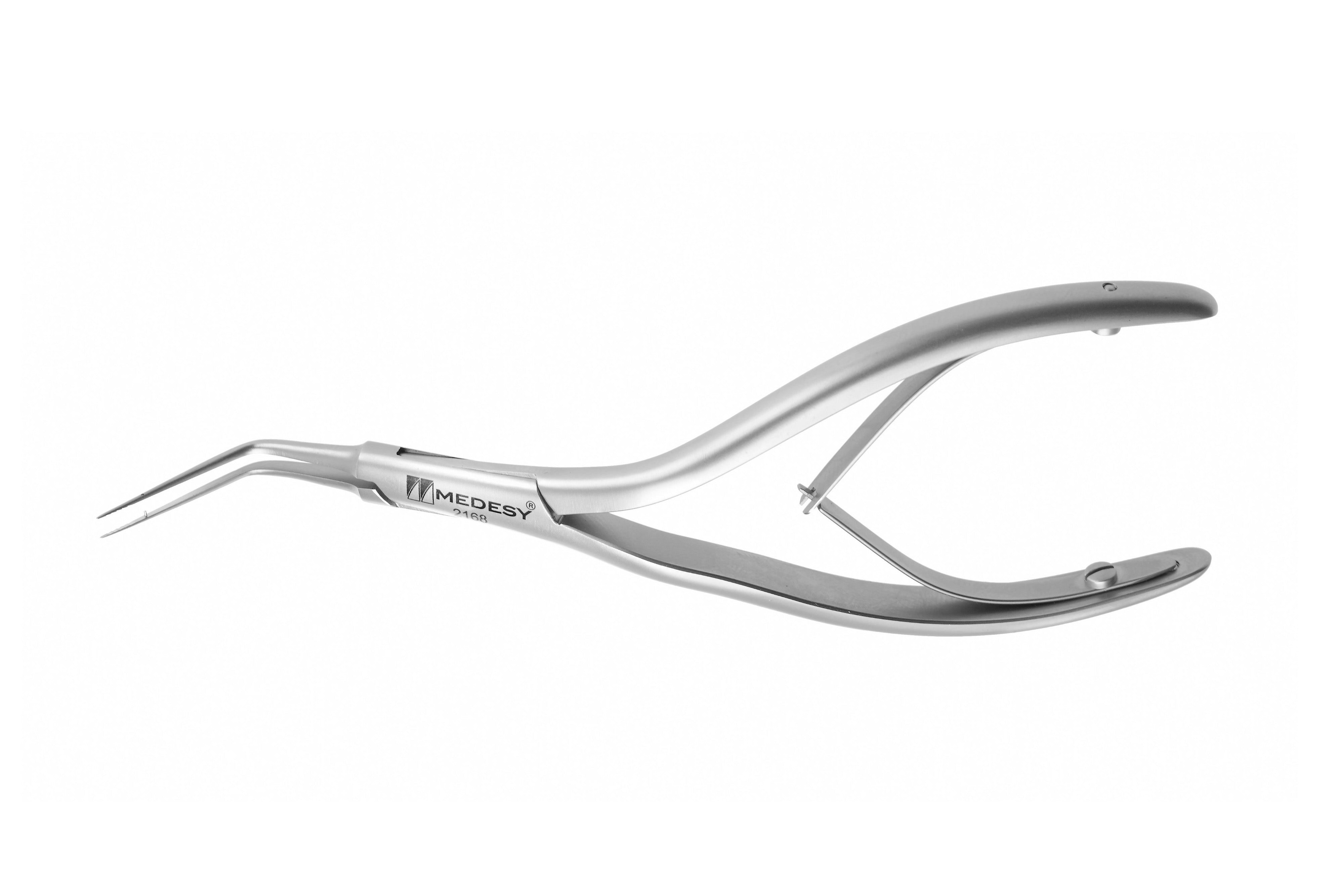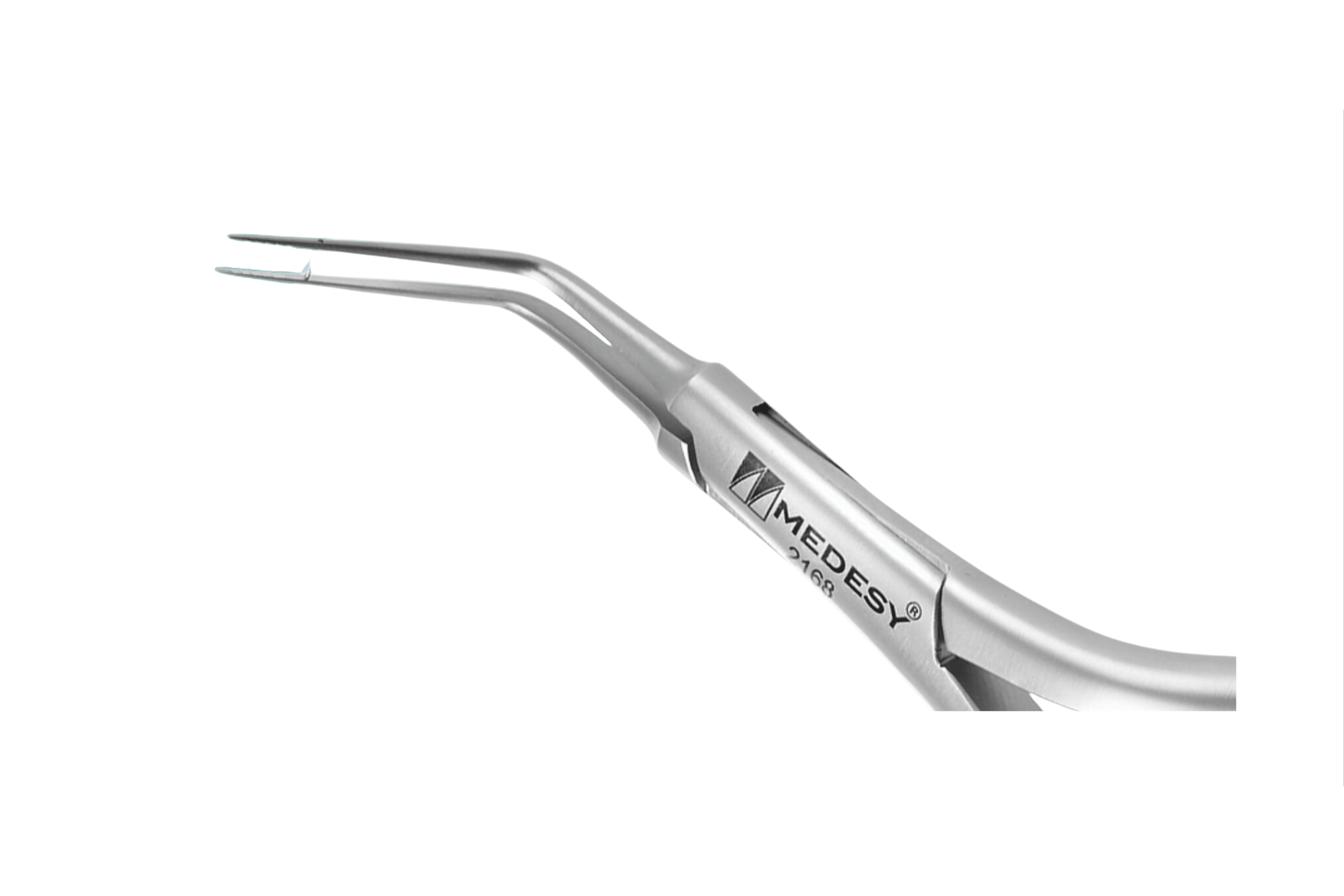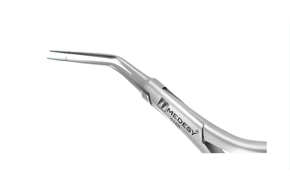 Curved 30 degrees from the handle. The tip is 20 mm long and 0.8 mm in diameter.